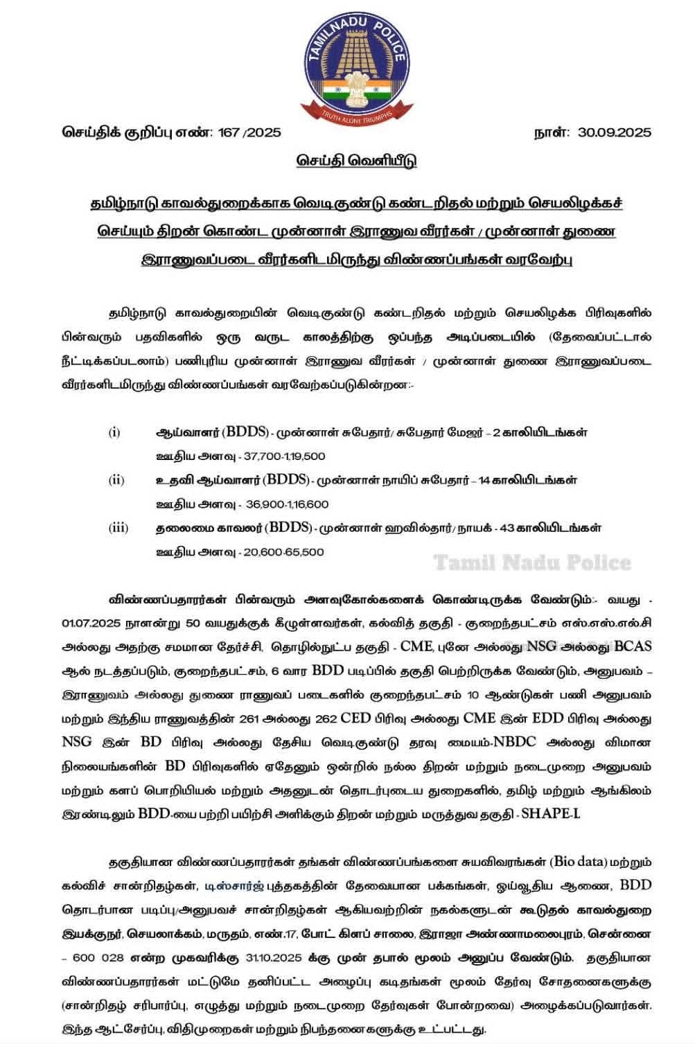 अगर आप Tamil Nadu में government job की तलाश में हैं, तो Tamil Nadu Police Recruitment 2025 आपके लिए perfect opportunity है। Inspector और Head Constable के पदों के लिए offline आवेदन 31-Oct-2025 तक possible है। सभी aspirants अपनी eligibility और documents check करके जल्द से जल्द apply करें।